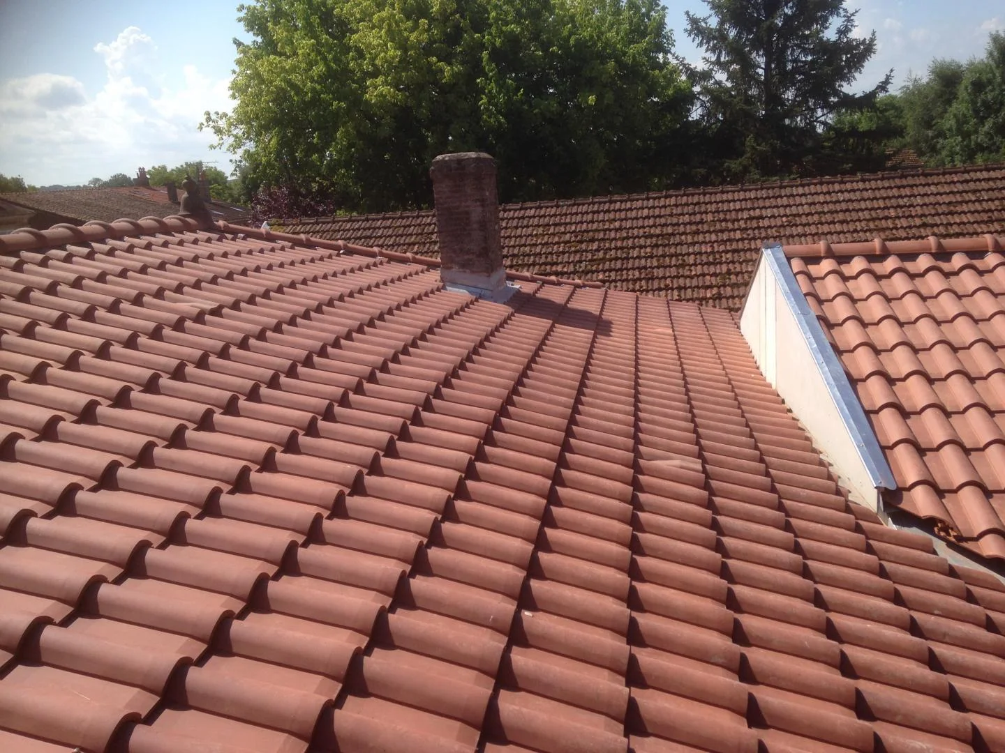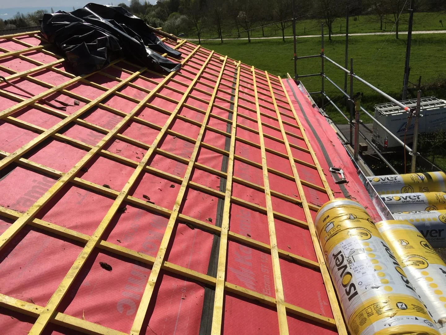 La couverture est installée avec soin pour assurer une protection efficace contre les intempéries. Les matériaux sont posés avec méthode pour une longévité optimale.